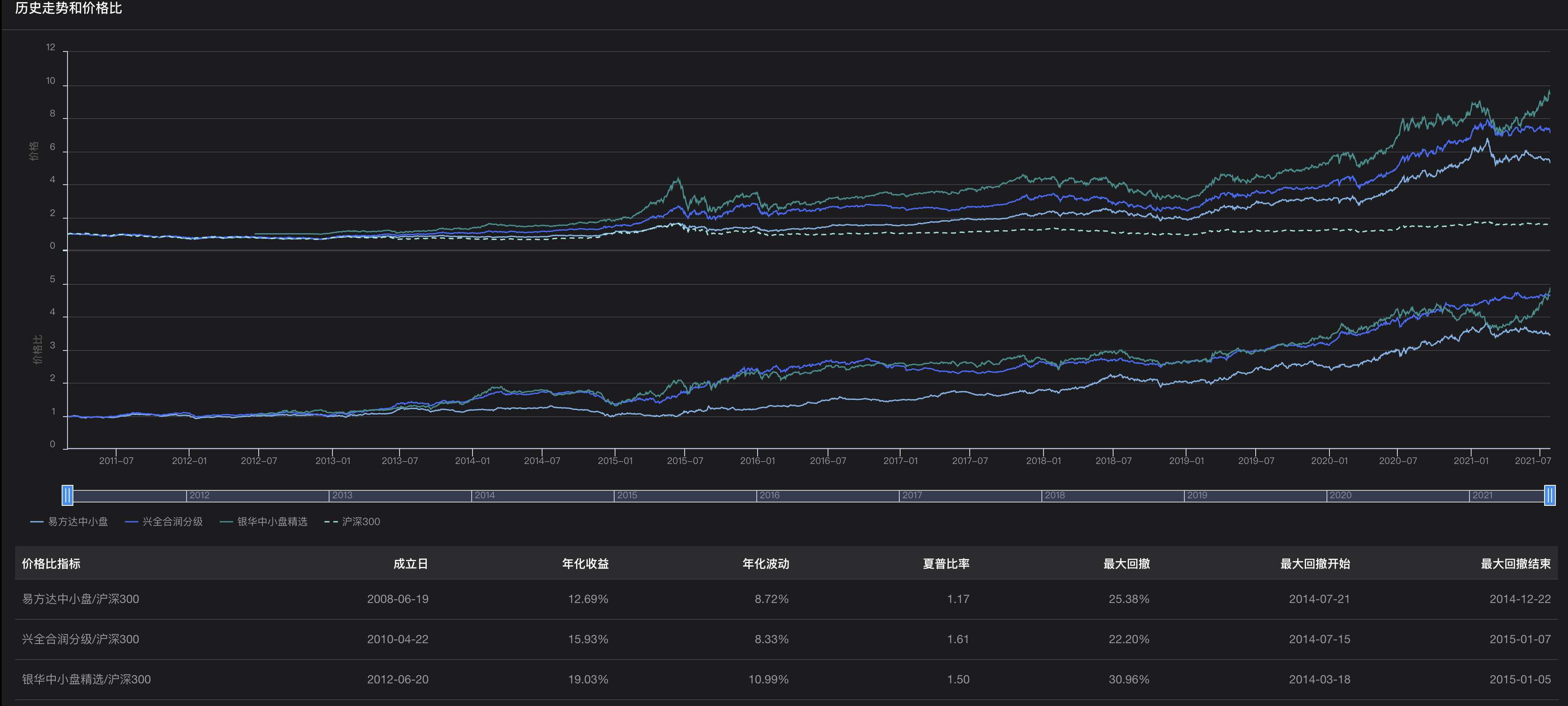 虽然还有很多专业的指标来衡量基金的好坏,但对于普通投资者而言,熟练使用价格比工具就可以很好地解决基金比较的问题了。在比较不同基金的时候,价格比曲线向右上方延伸的坡度越陡峭,意味着超额收益率越高;曲线越平滑,上面的“毛刺”越少,那么它的最大回撤就越低,意味着超额收益的稳定性越高。
