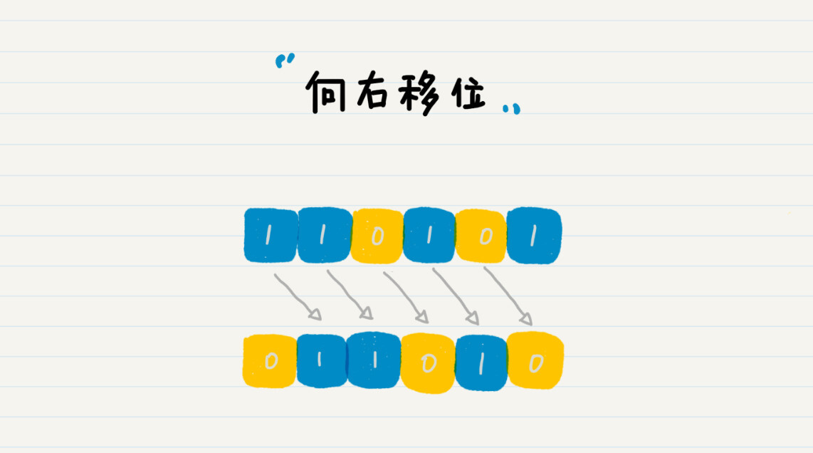 二进制110101向右移一位,就是去除末尾的那一位,因此110101就变成了11010(最前面的0可以省略)。我们将11010换算为十进制,就是26,正好是53除以2的整数商。所以二进制右移一位,就是将数字除以2并求整数商的操作。
