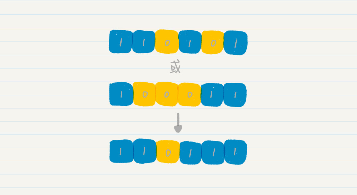 逻辑“或”的意思是,参与操作的位中只要有一个位是1,那么最终结果就是1,也就是“真”。如果我们将二进制110101和100011的每一位对齐,进行按位的“或”操作,就会得到110111。