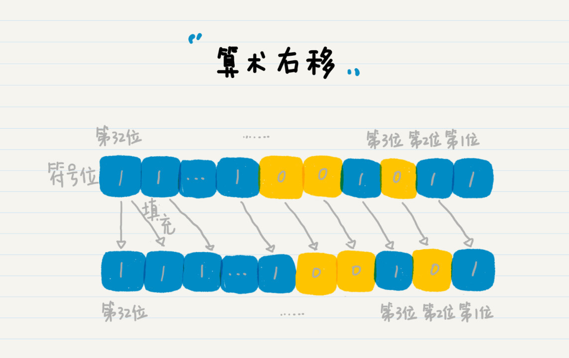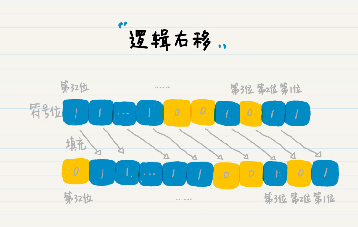 那么这个时候向右移位,就会产生一个问题:对于符号位(特别是符号位为1的时候),我们是否也需要将其右移呢?因此,Java里定义了两种右移,逻辑右移和算术右移。逻辑右移1位,左边补0即可。