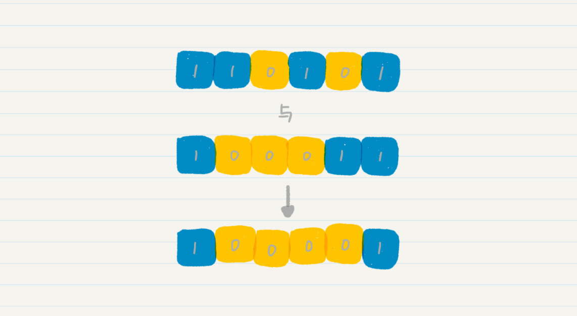 同理,我们也可以针对位进行逻辑“与”的操作。“与”的意思是,参与操作的位中必须全都是1,那么最终结果才是1(真),否则就为0(假)。如果我们将二进制110101和100011的每一位对齐,进行按位的“与”操作,就会得到100001。