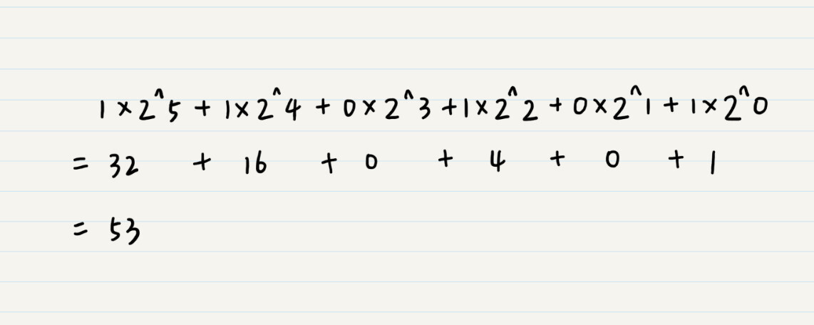 明白了十进制,我们再试着用类似的思路来理解二进制的定义。我以二进制数字110101为例,解释给你听。我们先来看,这里110101究竟代表了十进制中的数字几呢?