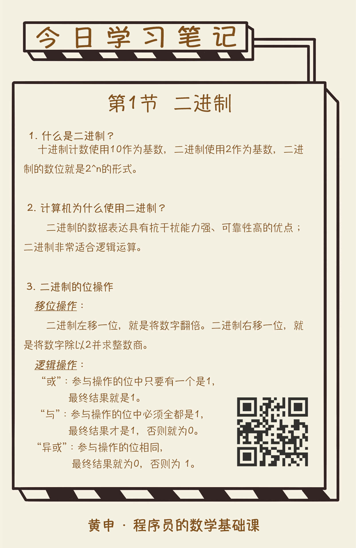 今天我们聊了二进制,你可能会问:学习二进制究竟有什么用呢?平时的编程中,我们好像并没有使用相关的知识啊?确实,目前的高级语言可以帮助我们将人类的思维逻辑转换为使用0和1的机器语言,我们不用再为此操心了。但是,二进制作为现代计算机体系的基石,这些基础的概念和操作,你一定要非常了解。