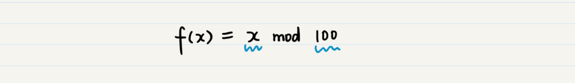在这个公式中,x表示等待被转换的数值,而size表示有限存储空间的大小,mod表示取余操作。通过余数,你就能将任何数值,转换为有限范围内的一个数值,然后根据这个新的数值,来确定将数据存放在何处。
