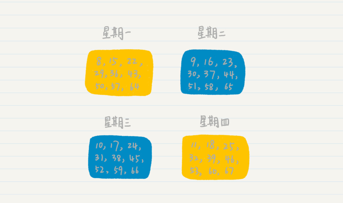 我们再拿上面星期的例子来看。假如今天是星期一,从今天开始的100天里,都有多少个星期呢?你拿100除以7,得到商14余2,也就是说这100天里有14周多2天。换个角度看,我们可以说,这100天里,你的第1天、第8天、第15天等等,在余数的世界里都被认为是同一天,因为它们的余数都是1,都是星期一,你要上班的日子。同理,第2天、第9天、第16天余数都是2,它们都是星期二。