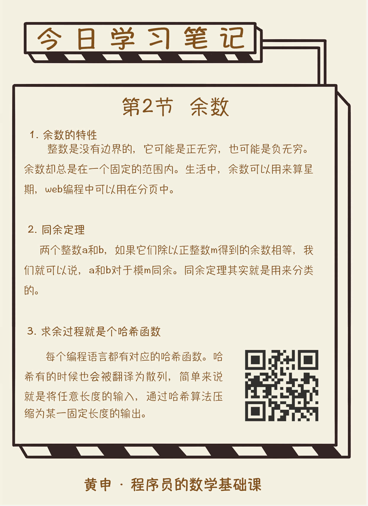 余数只是数学知识中的沧海一粟。你在中学或者大学的时候,肯定接触过很多的数学知识和定理,编程的时候也会经常和数字、公式以及数据打交道,但是真正学懂数学的人却没几个。希望我们可以从余数这个小概念开始,让你认识到数学思想其实非常实用,用好这些知识,对你的编程,甚至生活都有意想不到的作用。