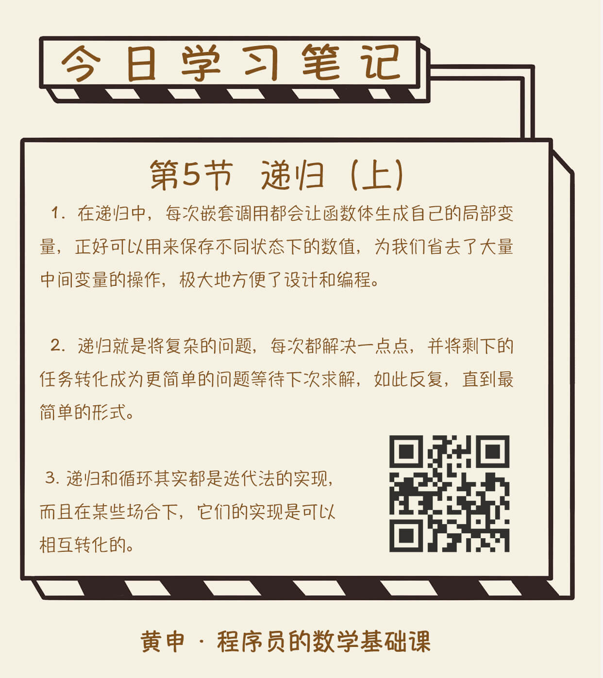 你应该能看到,虽然迭代法的思想是可行的,但是如果用循环来实现,恐怕要保存好多中间状态及其对应的变量。说到这里,你是不是很容易就想到计算编程常用的函数递归?