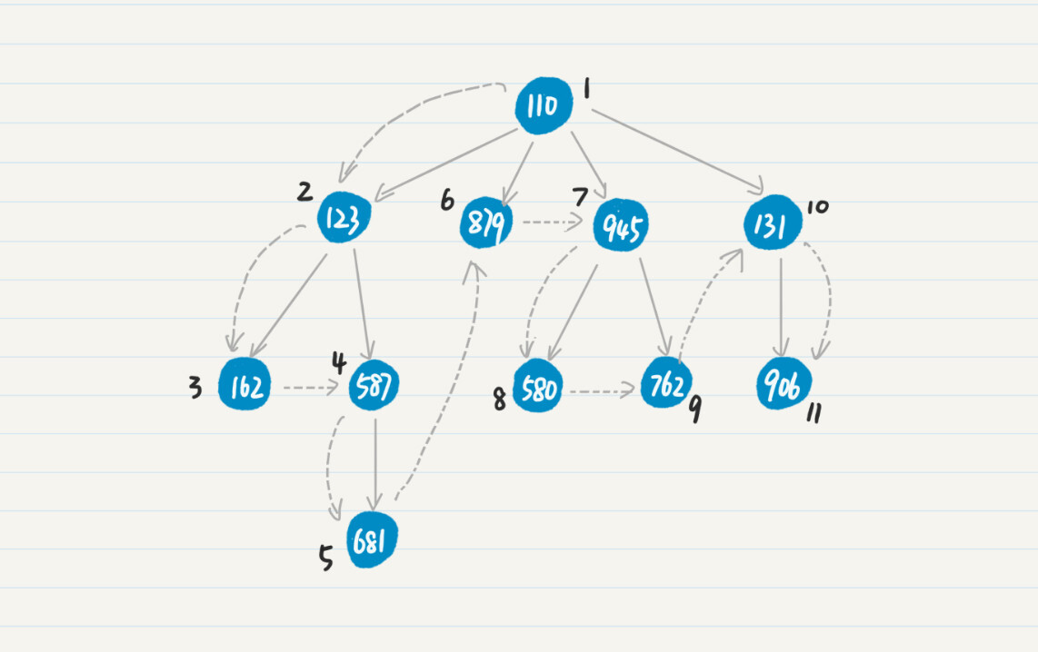 其中,结点上的数字表示结点的ID,而虚线表示遍历前进的方向,结点边上的数字表示该结点在深度优先搜索中被访问的顺序。在深度优先的策略下,我们从点110出发,然后发现和110相连的点123,访问123后继续发现和123相连的点162,再往后发现162没有出度,因此回退到123,查看和123相连的另一个点587,根据587的出度继续往前推进,如此类推。