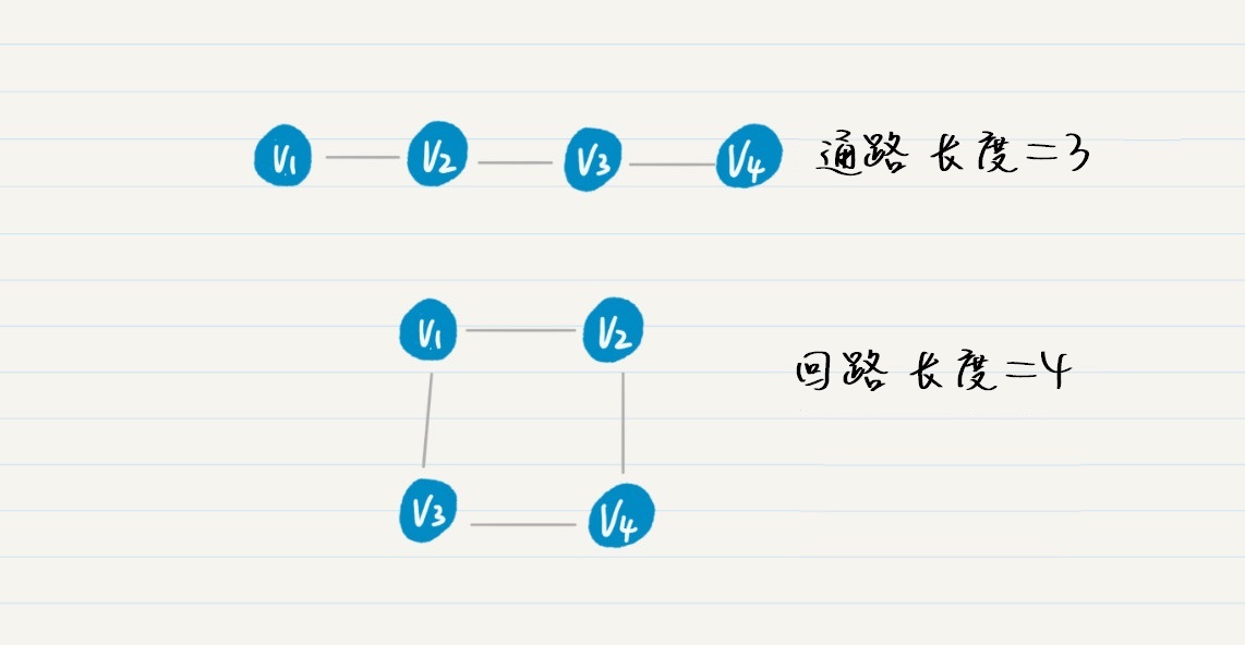 结点和边的交替序列组成的就是通路。所以,通路上的任意两个结点其实就是互为连通的。如果一条通路的起始点\(v\_{1}\)和终止点\(v\_{n}\)相同,这种特殊的通路我们就叫作回路。从起始点到终止点所经过的边之数量,就是通路的长度。这里我画了一张图,这里面有1条通路和1条回路,第一条非回路通路的长度是3,第二条回路的长度是4。