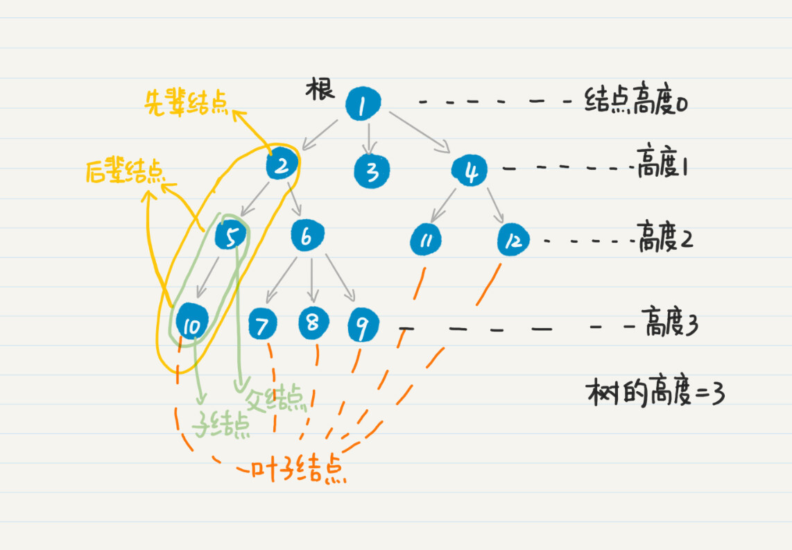 除了这些基本定义,有向树还有几个重要的概念,父结点、子结点、兄弟结点、先辈结点、后辈结点、叶子结点、结点的高度(或深度)、树的高度(或深度)。这些都不难理解,我画个图展示一下,你就能明白了。我把根结点的高度设置为0,根据需要你也可以设置为1。
