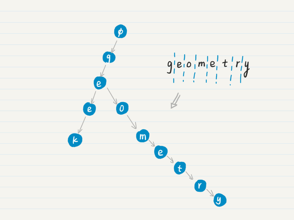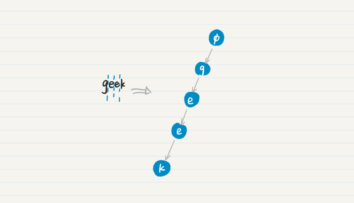 我们以单词geek为例,从根结点开始,第一次我增加字符g,在根结点下增加一个“g”的结点。第二次,我在“g”结点下方增加一个“e”结点。以此类推,最终我们可以得到下面的树。