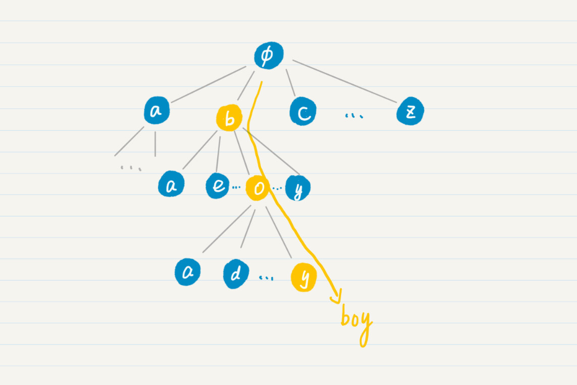 不过在平时的生活中,咱们查字典并不是这么做的。我们都是从单词的最左边的字母开始,逐个去查找。比如查找“boy”这个单词,我们一般是这么查的。首先,在a~z这26个英文字母里找到单词的第一个字母b,然后在b开头的单词里找到字母o,最终在bo开头的单词里找到字母y。