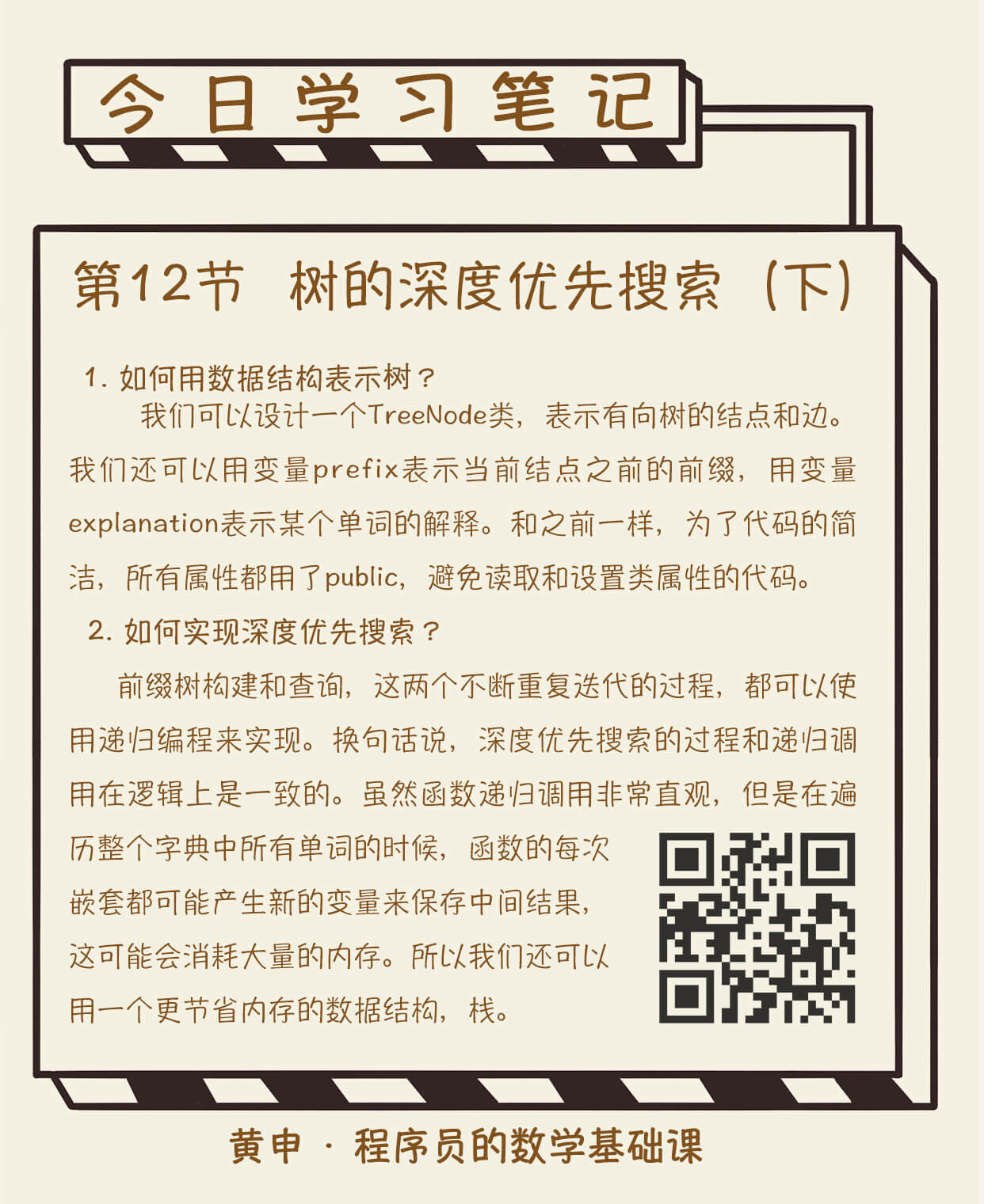 仔细观察前缀树构建和查询,你会发现这两个不断重复迭代的过程,都可以使用递归编程来实现。换句话说,深度优先搜索的过程和递归调用在逻辑上是一致的。