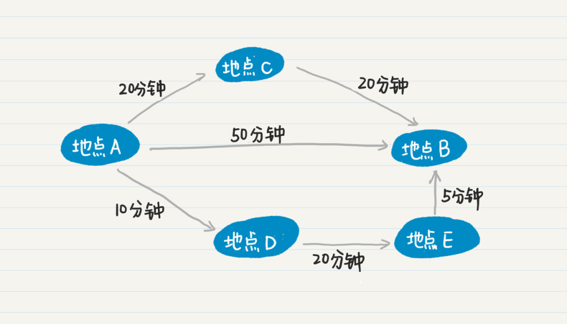 我们使用Dijkstra算法来查找地图中两点之间的最短路径,而今天我所介绍的Dijkstra使用了更为抽象的“权重”。如果我们把结点作为地理位置,边的权重设置为路上所花费的时间,那么Dijkstra算法就能帮助我们找到,任意两个点之间耗时最短的路线。