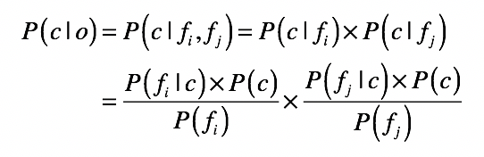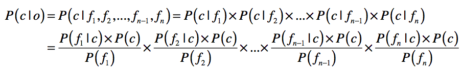 在新闻分类中,o就表示一篇文章,而c表示新闻的种类(包括政治、军事、财经等等)。而属性字段f就是我们从文档集而建立的各种单词。公式等号左边的P(c|f)就是待分类新闻中,出现单词f时,该新闻属于类别c的概率。而等号右边的P(f|c)是根据训练数据统计,得到分类c中出现单词f的概率。P( c )是分类c在新闻训练数据中出现的概率,P(f)是单词f在训练样本中出现的概率。