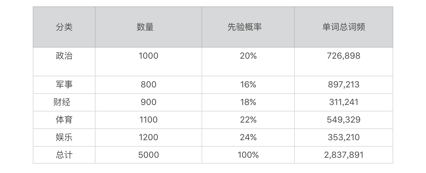 在上表中,你会发现某些单词从未在某个分类中出现,例如“航母”这个词从未在“体育”和“娱乐”这两个分类中出现。对于这种情况,我们可以使用平滑(smoothing)的技术,将其词频或条件概率设置为一个极小的值。这里,我设置了最小的词频,也就是1。