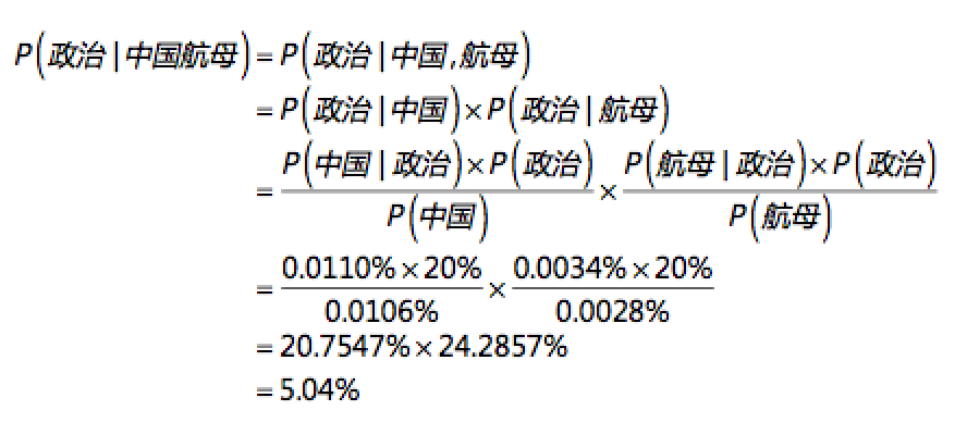 可以看出来,“中国航母”这个短语本身属于“政治”和“军事”分类的可能性最高,而属于“财经”的可能性最低。需要注意的是,我在上述公式使用了中文词便于你的理解,在真正的实现中,我们需要将中文词和中文分类名称转换为数字型的ID,以提高系统的效率。