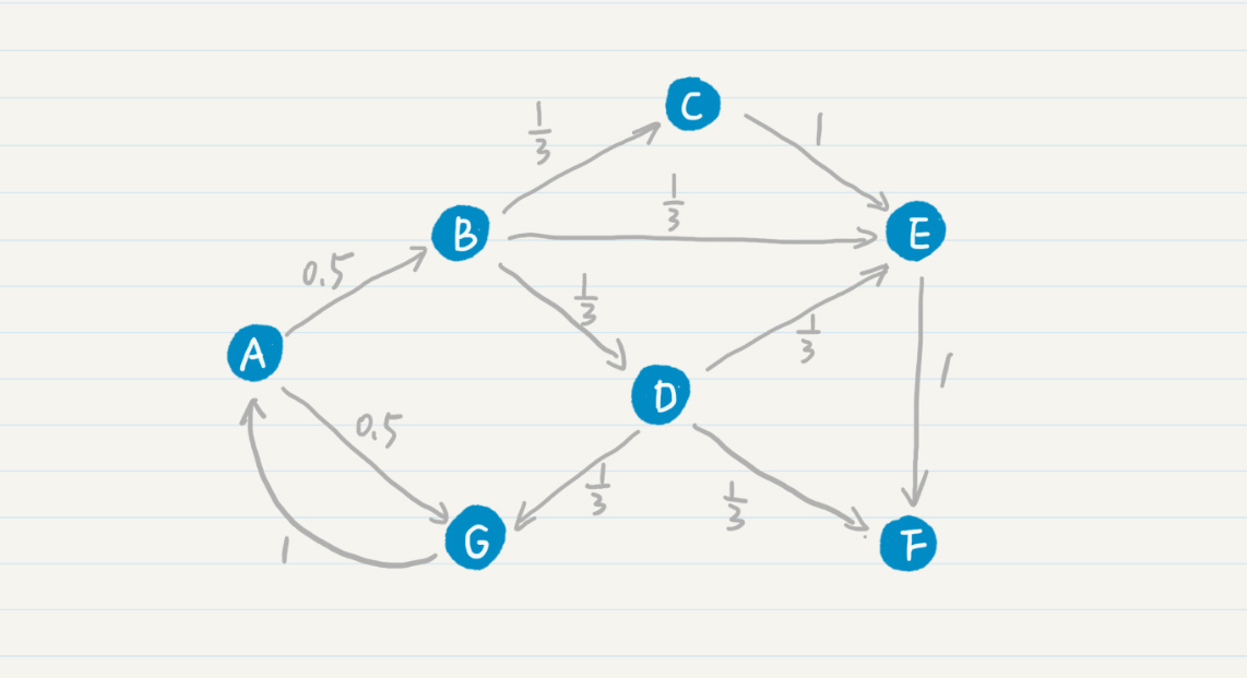 另外,在最基本的PageRank算法中,我们可以假设每张网页的出度是\(n\),那么从这张网页转移到任何下一张相连网页的概率都是\(\\frac{1}{n}\),因此这个转移的概率只和当前页面有关,满足一阶马尔科夫模型的假设。我在之前的拓扑结构中添加了转移的概率。