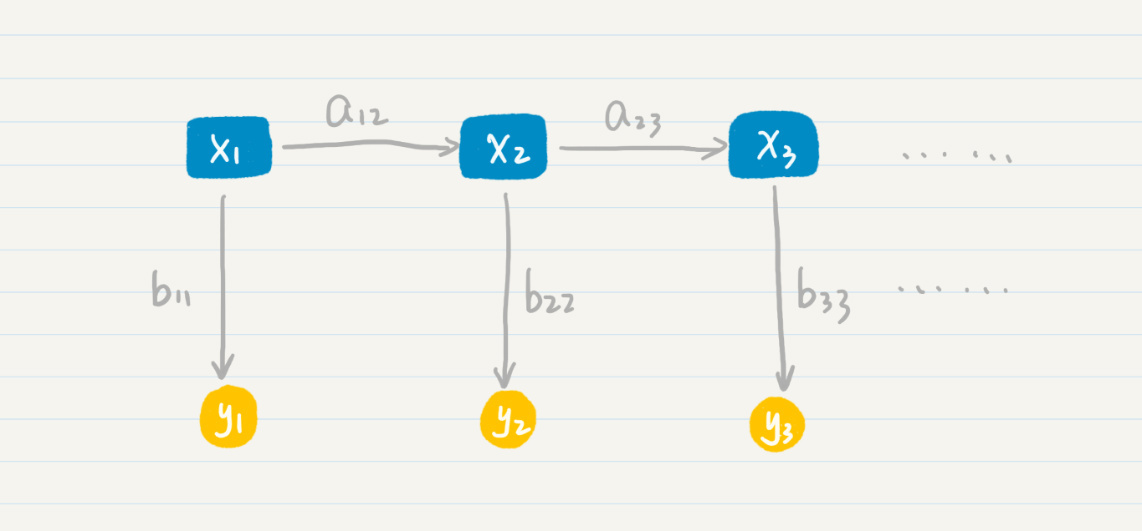 其中,\(x\_{1},x\_{2},x\_{3}\)等等属于隐藏状态层,\(a\_{12}\)表示了从状态\(x\_{1}\)到\(x\_{2}\)的转移概率,\(a\_{23}\)表示了从状态\(x\_{2}\)到\(x\_{3}\)的转移概率。这一层和普通的马尔科夫模型是一致的,可惜在隐马尔科夫模型中我们无法通过数据直接观测到这一层。我们所能看到的是,\(y\_{1},y\_{2},y\_{3}\)等等代表的“输出层”。另外,\(b\_{11}\)表示了从状态\(x\_{1}\)到\(y\_{1}\)的输出概率,\(b\_{22}\)表示了从状态\(x\_{2}\)到\(y\_{2}\)的输出概率,\(b\_{33}\)表示了从状态\(x\_{3}\)到\(y\_{3}\)的输出概率等等。