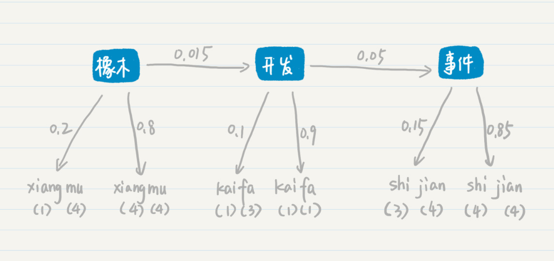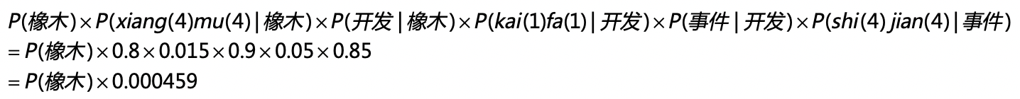 在第二种的可能性中,三个确定的状态是“橡木”“开发”和“事件”这三个词。从“橡木”转移到“开发”的概率是0.015,从“开发”转移到“事件”的概率是0.05。从“橡木”输出“xiang(一声)mu(四声)”的概率是0.2,输出“xiang(四声)mu(四声)”的概率是0.8,“开发”和“事件”也有类似的输出概率。和第一种情况类似,我们可以计算“橡木开发事件”这个词组最后生成的概率是多少,我用下面这个公式来推导: