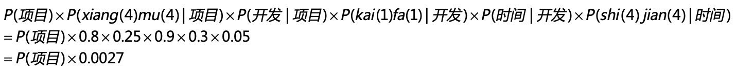 好,有了这些概率的分布,我们来看看“项目开发时间”这个词组最后生成的概率是多少。在两层模型的条件概率公式中,我代入了具体的概率值并使用了如下的推导: