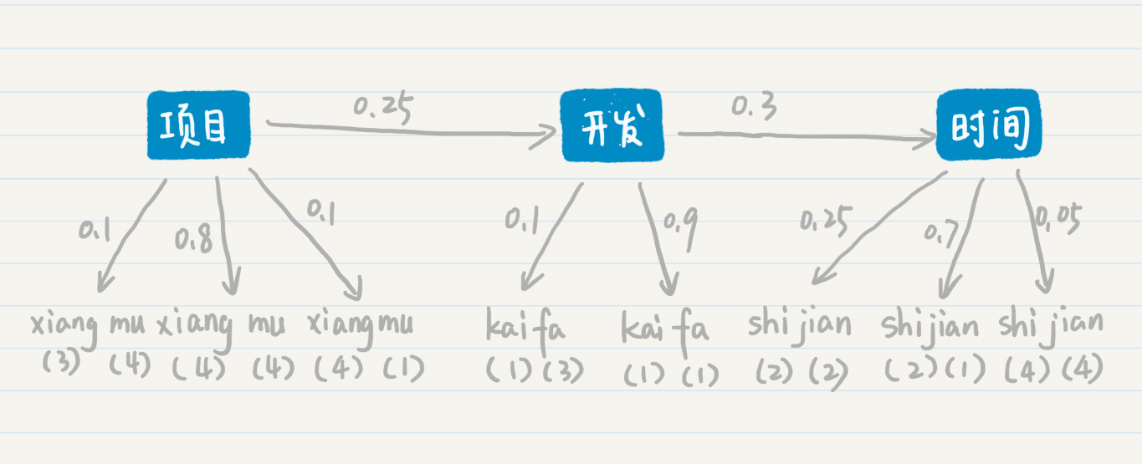 第一种情况下,三个确定的状态是“项目”“开发”和“时间”这三个词。从“项目”转移到“开发”的概率是0.25,从“开发”转移到“时间”的概率是0.3。从“项目”输出“xiang(三声)mu(四声)”的概率是0.1,输出“xiang(四声)mu(四声)”的概率是0.8,输出“xiang(四声)mu(一声)”的概率是0.1,“开发”和“时间”也有类似的输出概率。