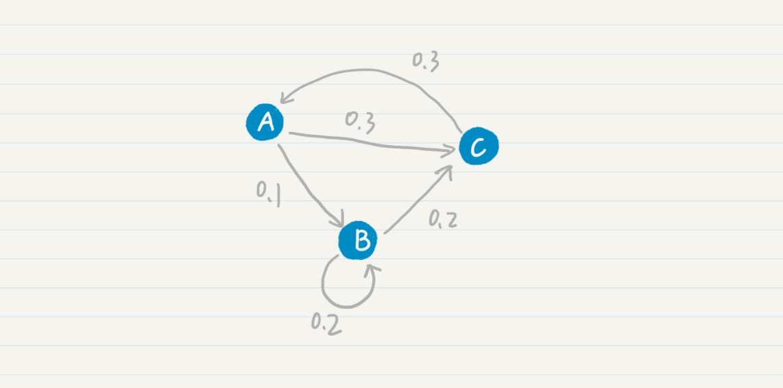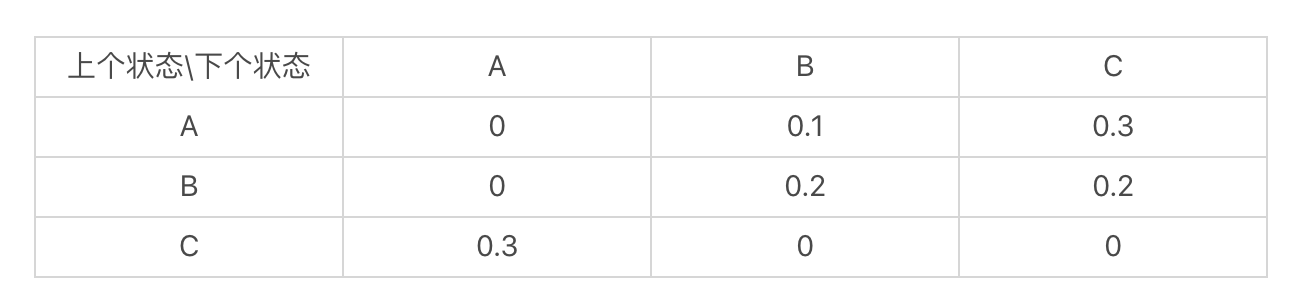 在这张图中,你可以看到,从状态A到B的概率是0.1,从状态B到状态C的概率是0.2等等。我们也可以使用状态转移表来表示这张图。