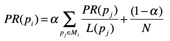 其中,\(p\_{i}\)表示第\(i\)张网页,\(M\_{i}\)是\(p\_{i}\)的入链接集合,\(p\_{j}\)是\(M\_{i}\)集合中的第\(j\)张网页。\(PR\_{(p\_{j})}\)表示网页\(p\_{j}\)的PageRank得分,\(L\_{(p\_{j})}\)表示网页\(p\_{j}\)的出链接数量,\(\\frac{1}{L\_{(p\_{j})}}\)就表示从网页\(p\_{j}\)跳转到\(p\_{i}\)的概率。\(α\)是用户不进行随机跳转的概率,\(N\)表示所有网页的数量。