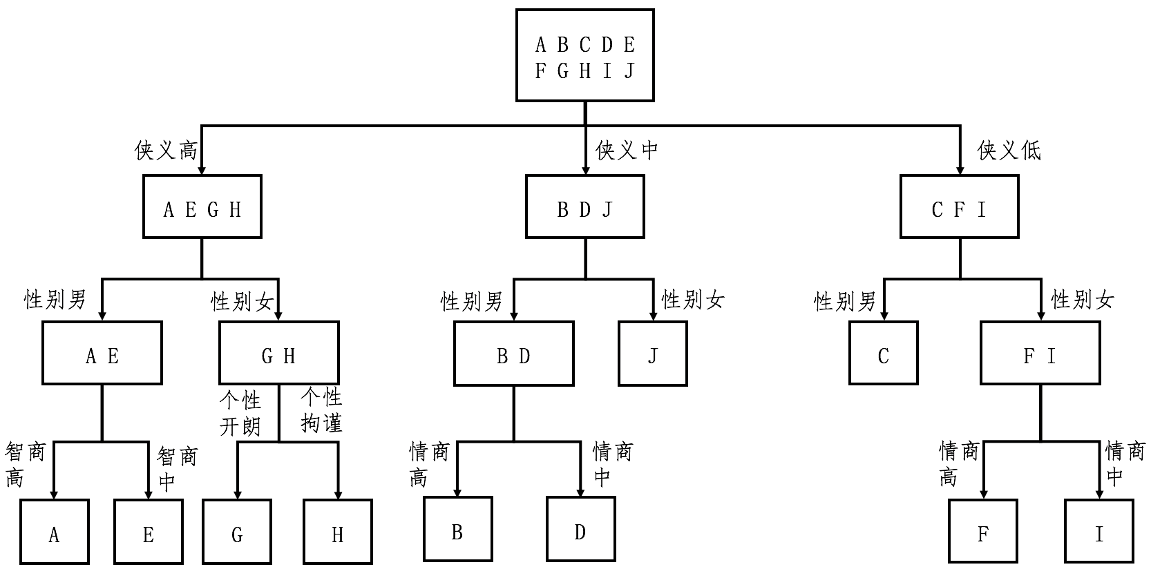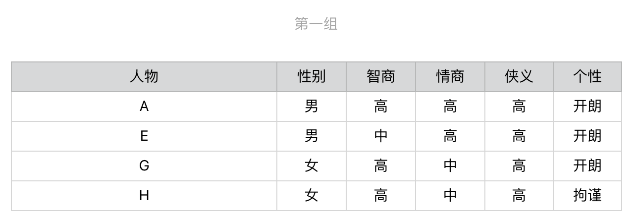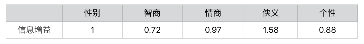 我们现在开始选择第一个问题。首先,依次计算“性别”“智商”“情商”“侠义”和“个性”对人物进行划分后的信息增益。我们得到如下结果: