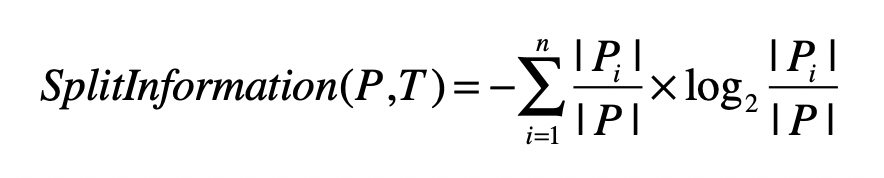熵计算的时候考虑的是,集合内数据是否属于同一个类,因此即使集合数量很多,但是集合内的数据如果都是来自相同的分类(或分组),那么熵还是会很低。而这里的分裂信息是不同的,它只考虑子集的数量。如果某个特征取值很多,那么相对应的子集数量就越多,最终分裂信息的值就会越大。正是因为如此,人们可以使用分裂信息来惩罚取值很多的特征。具体的计算公式如下: