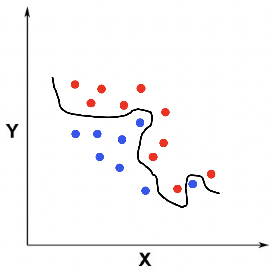 这张图中,蓝色的点表示分类1的训练数据点,红色的点表示分类2的训练数据点。在适度拟合的时候,分界线比较好地区分了蓝色和红色的点。