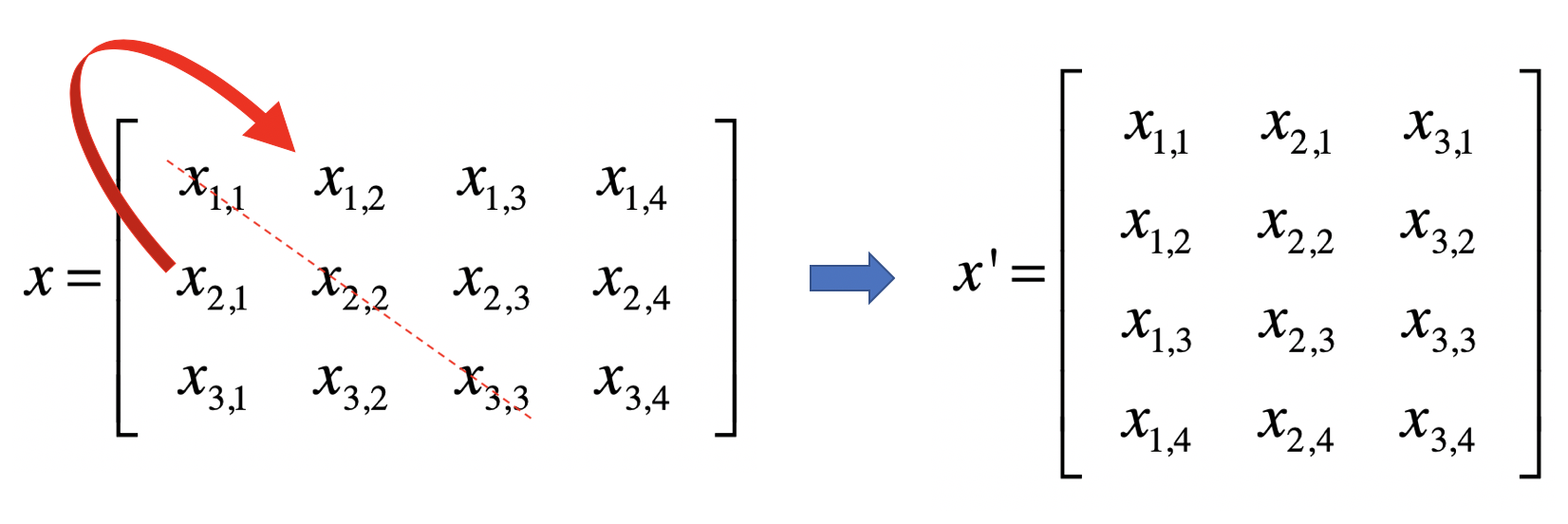 转置(Transposition)是指矩阵内的元素行索引和纵索引互换,例如\(X\_{ij}\)就变为\(X\_{ji}\),相应的,矩阵的形状由转置前的n × m变为转置后的m × n。从几何的角度来说,矩阵的转置就是原矩阵以对角线为轴进行翻转后的结果。下面这张图展示了矩阵\(X\)转置之后的矩阵\(X’\)