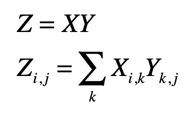 其中,矩阵\(Z\)为矩阵\(X\)\(Y\)的乘积,\(X\)是形状为i x k的矩阵,而\(Y\)是形状为k × j的矩阵。\(X\)的列数k必须和\(Y\)的行数k相等,两者才可以进行这样的乘法。