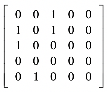 adj = np.full([N,N], [[0,0,1,0,0],[1,0,1,0,0],[1,0,0,0,0],[0,0,0,0,0],[0,1,0,0,0]], dtype=float)