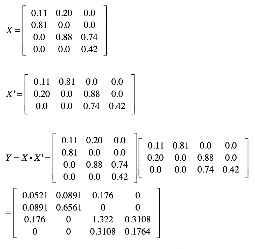 我们以基于用户的过滤为例。假设我们使用夹角余弦来衡量相似度,那么我们就可以采用用户评分的矩阵点乘自身的转置来计算余弦夹角。用户评分的矩阵\(X\)中,每一行是某位用户的行向量,每个分量表示这位用户对某部电影的打分。而矩阵\(X’\)的每一列是某个用户的列向量,每个分量表示用户对某部电影的打分。