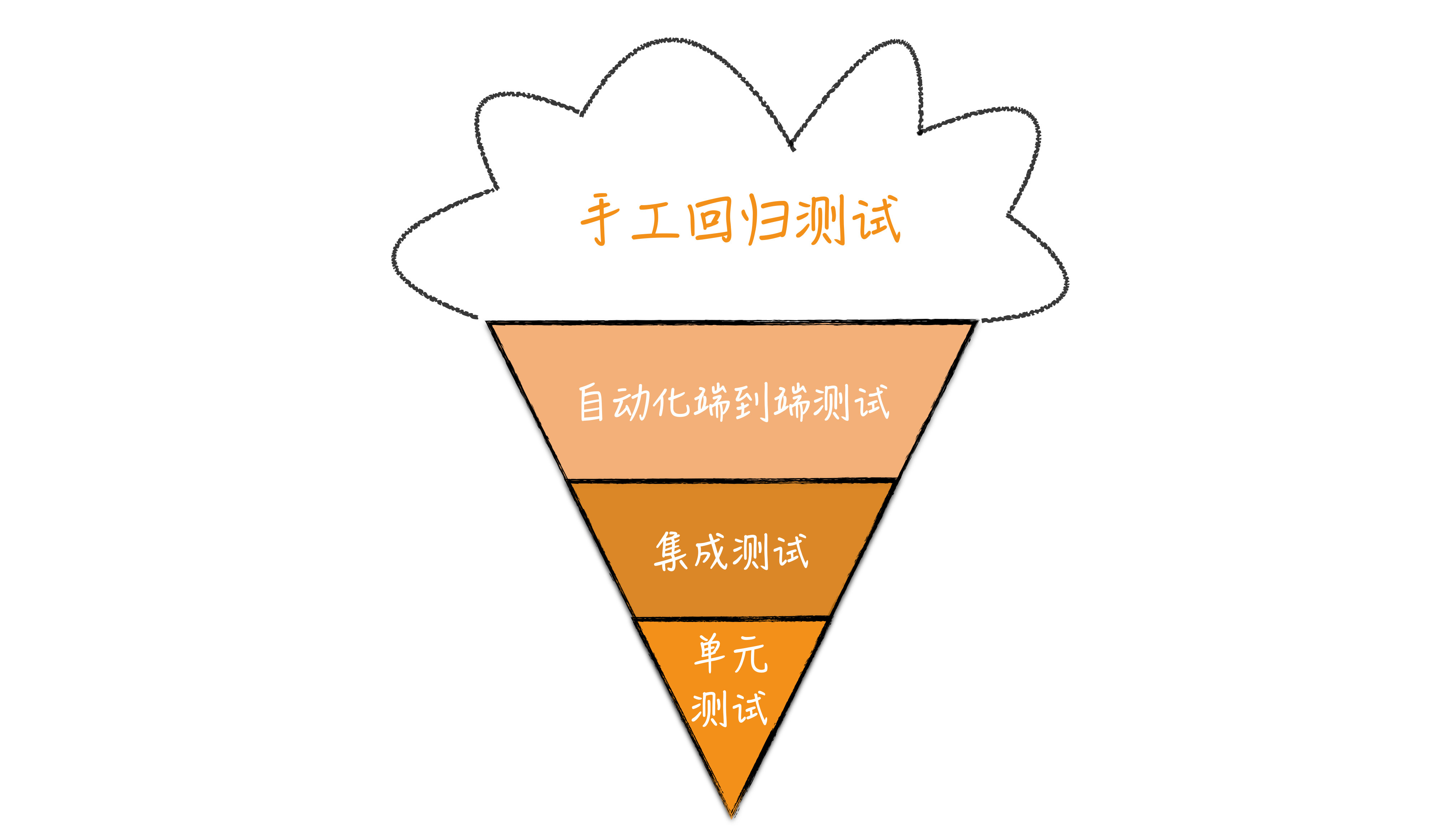 在这个图里,单元测试在最下面,表示它是底层的;然后层次逐渐升高,系统测试,也就是图上的端到端测试就是高层测试,在最上面。所有自动化测试形成了蛋卷部分,而外面的冰淇淋部分则是手工的测试。