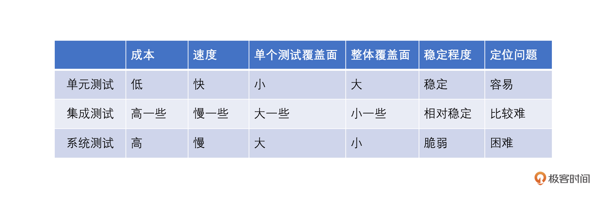 再比如,一旦测试出错,需要定位具体的问题。使用系统测试定位问题就如同大海捞针,难度系数很大,而单元测试因为只有一个单元,定位问题就要容易许多。我把刚刚讨论的内容整合成了一个表格,你可以对照着再复习一下。