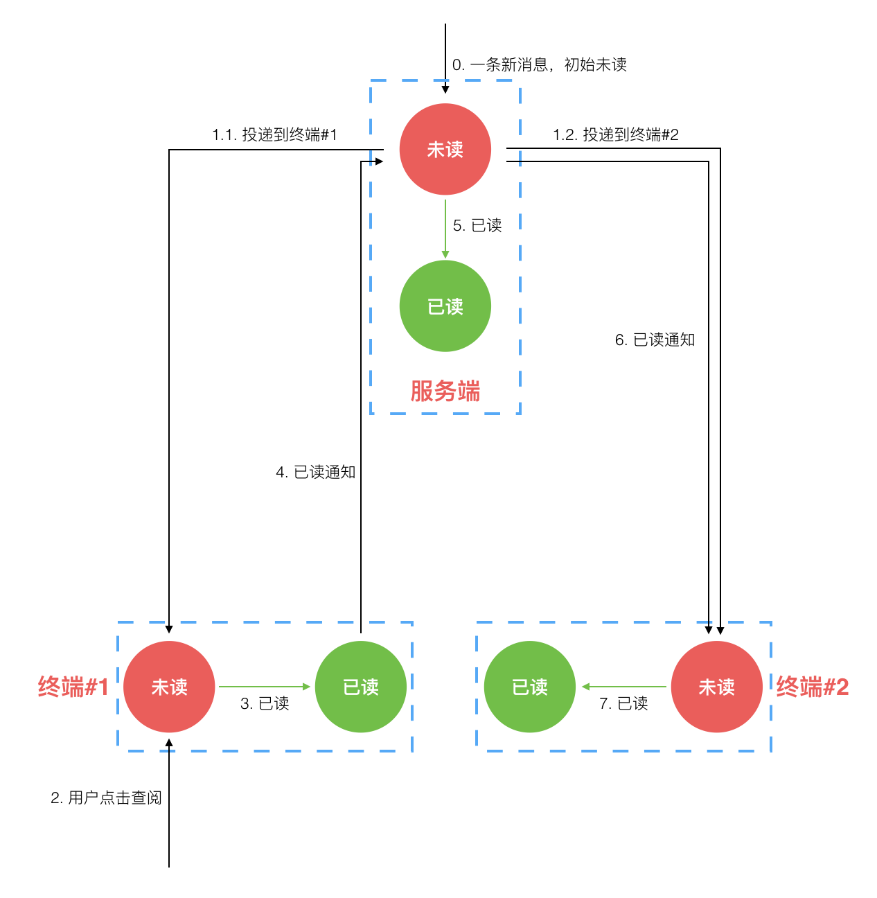 像咚咚这样的 IM 消息系统,就自带一个复杂的状态管理场景:消息的已读/未读状态。它的复杂性体现在,它本身就处在一个不可控的分布式场景下,在用户的多个终端和服务端之间,需要保持尽可能的最终一致性。