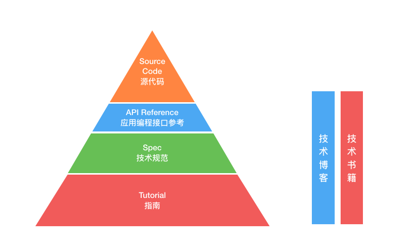 这里就借用原文里的一张图(重新按统一风格绘制了下),每一项开源框架或技术相关的学习资料可以组织成下面这张金字塔形的结构图。