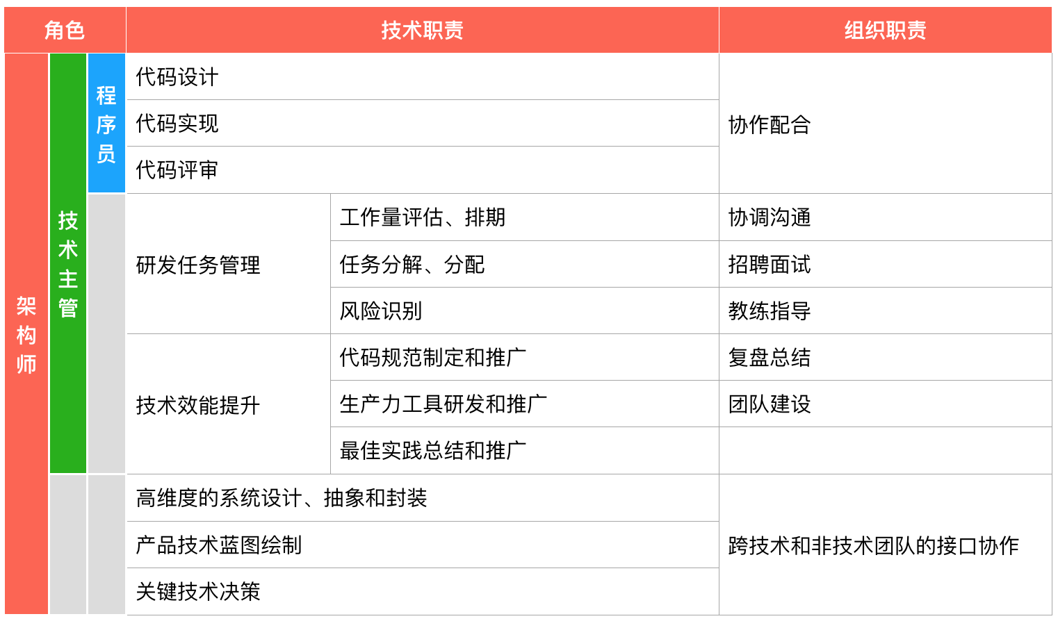 从程序员,到技术主管,再到架构师,名称变化了,角色的困惑我们也分析了,最后总结下这三种角色的工作内容和职责,如下表: