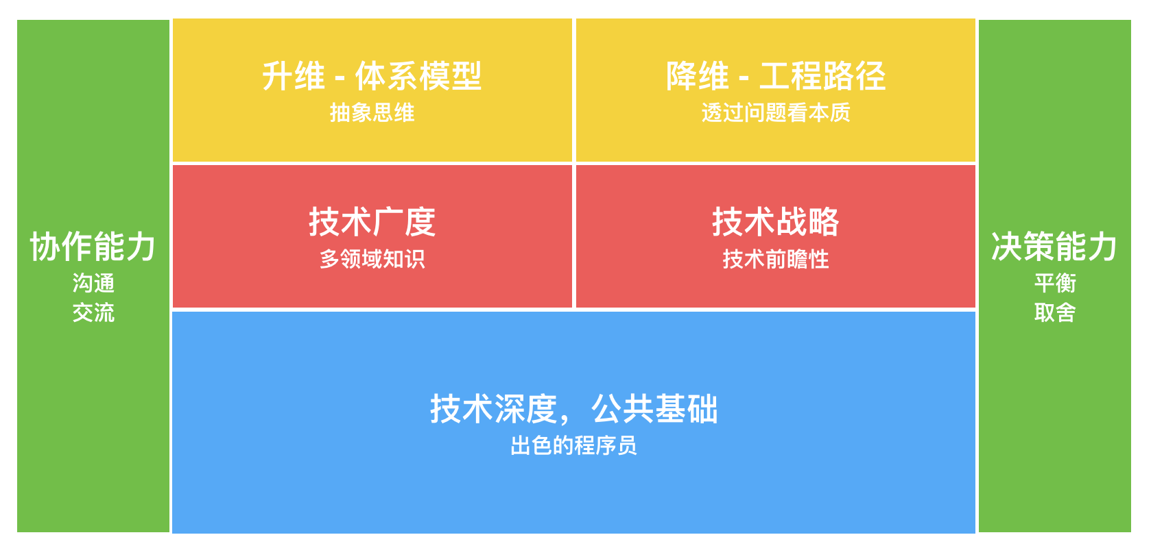 正因为业界和公司对架构师这个角色的职责定义很模糊,所以很多经验积累到一定程度的优秀程序员,并且在公司内被提升到一定高度的技术级别后,都会冠以 “架构师” 之名。但实际情况是大部分刚刚冠以“架构师”之名的优秀程序员,其能力模型大部分还停留在上图中的蓝色区域,而对其他区域并未有过系统性的认知和训练。