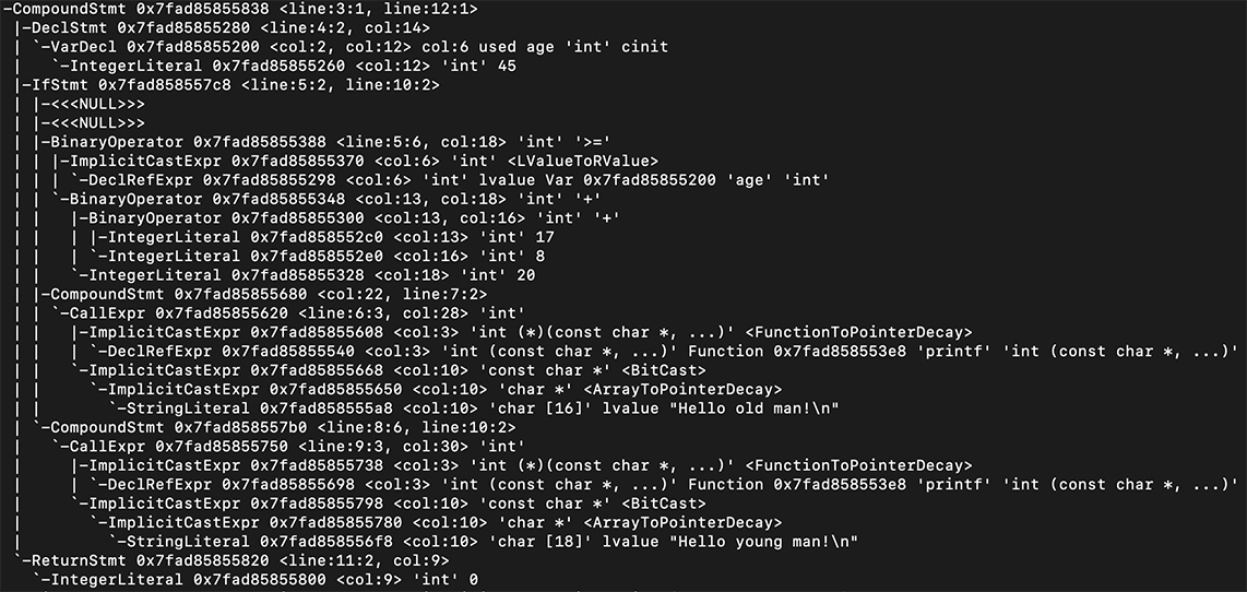 这个命令是运行苹果公司的C语言编译器来编译hello.c,-ast-dump参数使它输出AST,而不是做常规的编译。我截取了一部分输出结果给你看,从中你可以看到这棵树的结构。 试着修改程序,添加不同的语句,你会看到不同的语法树。