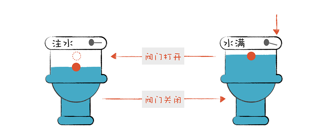 有限自动机是有限个状态的自动机器。我们可以拿抽水马桶举例,它分为两个状态:“注水”和“水满”。摁下冲马桶的按钮,它转到“注水”的状态,而浮球上升到一定高度,就会把注水阀门关闭,它转到“水满”状态。
