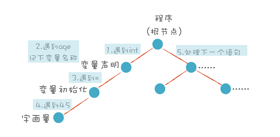 一种非常直观的构造思路是自上而下进行分析。首先构造根节点,代表整个程序,之后向下扫描Token串,构建它的子节点。当它看到一个int类型的Token时,知道这儿遇到了一个变量声明语句,于是建立一个“变量声明”节点;接着遇到age,建立一个子节点,这是第一个变量;之后遇到=,意味着这个变量有初始化值,那么建立一个初始化的子节点;最后,遇到“字面量”,其值是45。