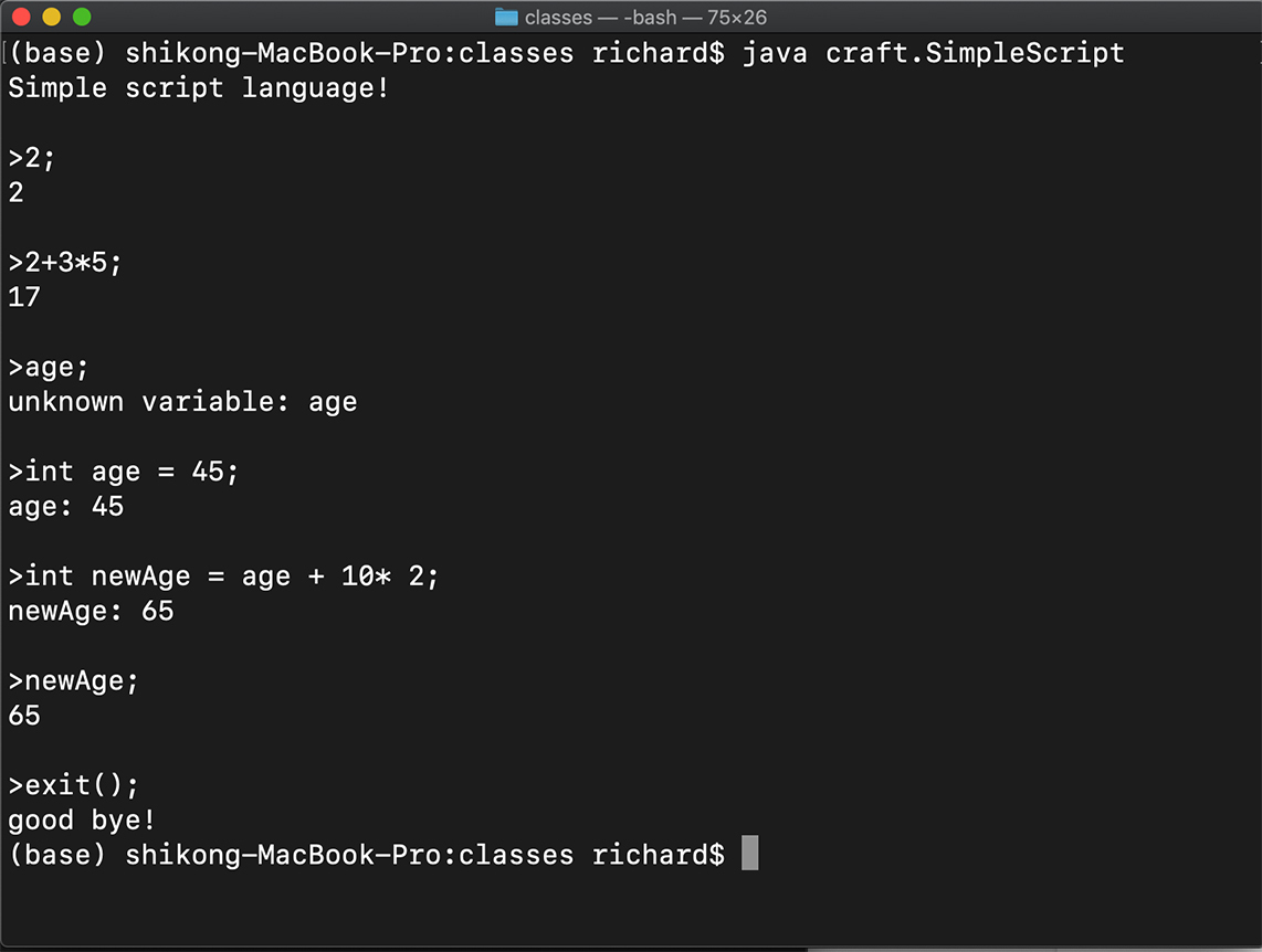 运行java craft.SimpleScript,你就可以在终端里尝试各种语句了。如果是正确的语句,系统马上会反馈回结果。如果是错误的语句,REPL还能反馈回错误信息,并且能够继续处理下面的语句。我们前面添加的处理语法错误的代码,现在起到了作用!下面是在我电脑上的运行情况: