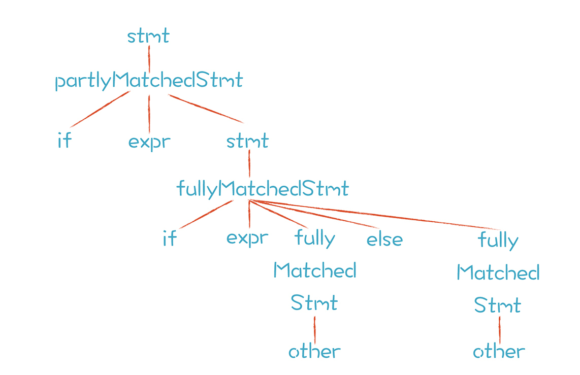 其中,解析第一个if语句时只能应用partlyMatchedStmt规则,解析第二个if语句时,只能适用fullyMatchedStmt规则。
