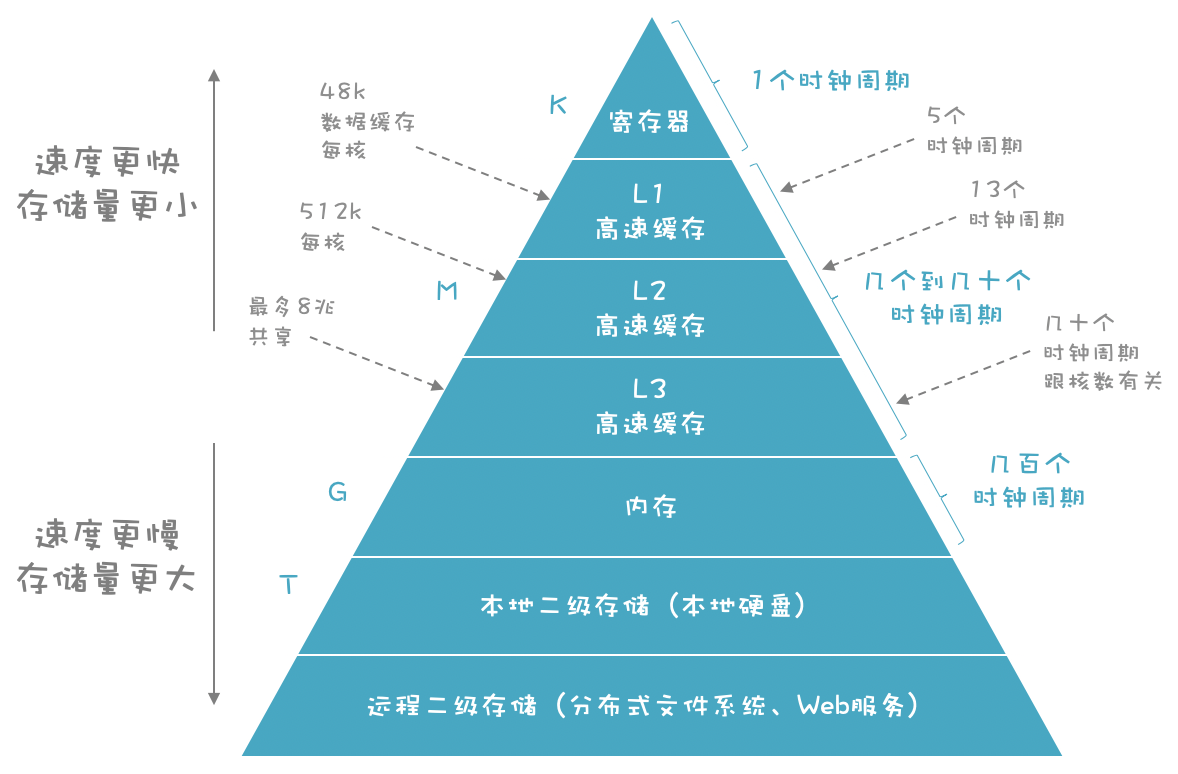 在图中的存储层次结构中,越往下,存取速度越慢,但是却可以有更大的容量,从寄存器的K级,到高速缓存的M级,到内存的G级,到磁盘的T级(灰色标的数据是Intel公司的Ice Lake架构的CPU的数据)。