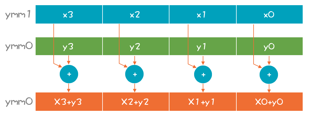 把矢量加法运算翻译成汇编语言的话,采用的指令是vpaddd(其中的p是pack的意思,对一组数据操作)。寄存器的名字是ymm(y开头意思是256位的)。