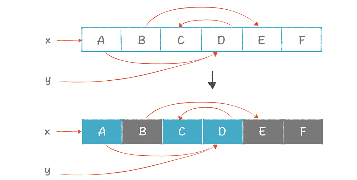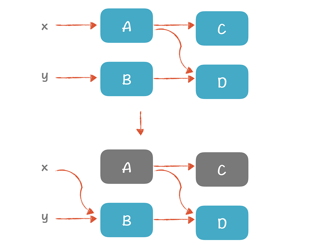 下面的示例图中,x和y是GC根节点,标记完毕以后,A、C和D是可达的,B、E和F是可收集的(我用不同的颜色做了标注)。
