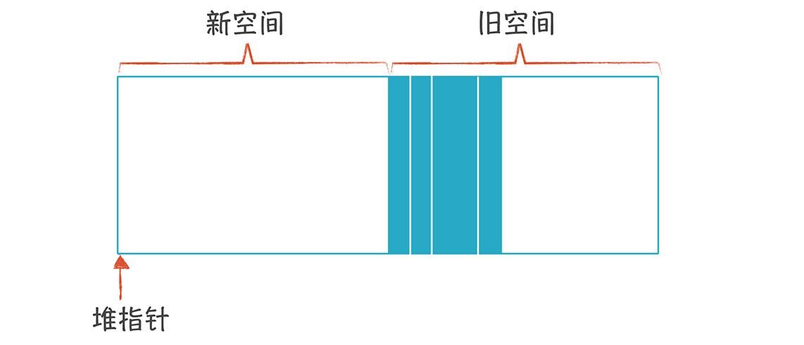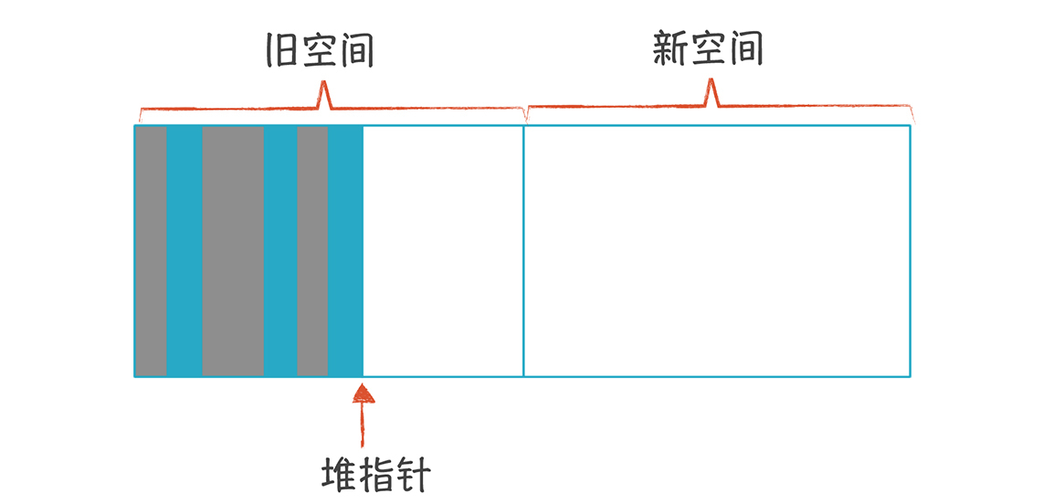 这里需要注意,旧空间里有一些对象可能已经不可达了(图中的灰色块),但你不用管。当旧空间变满时,就把所有可达的对象,拷贝到新空间,并且把新旧空间互换。这时,新空间里所有对象整齐排列,没有内存碎片。